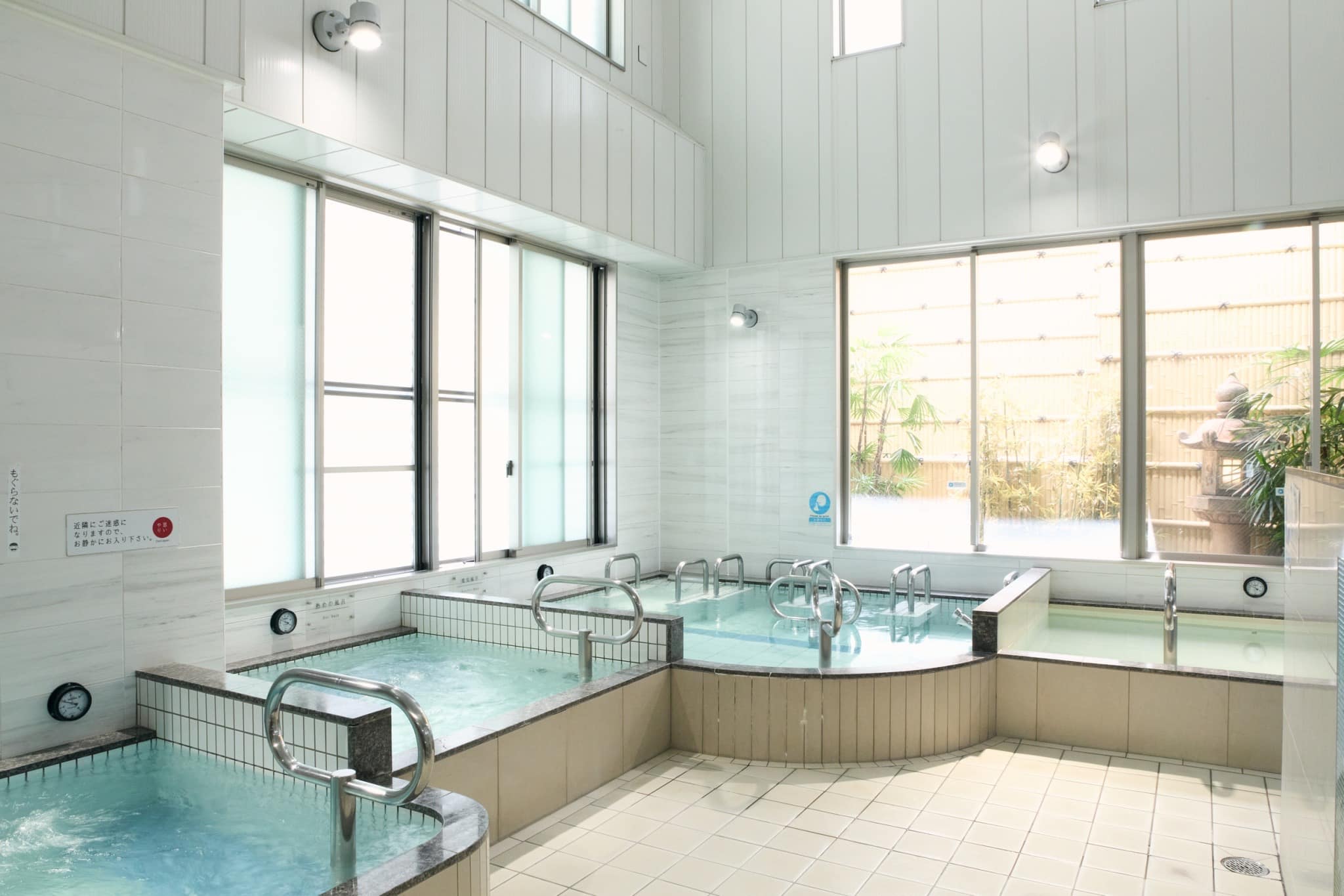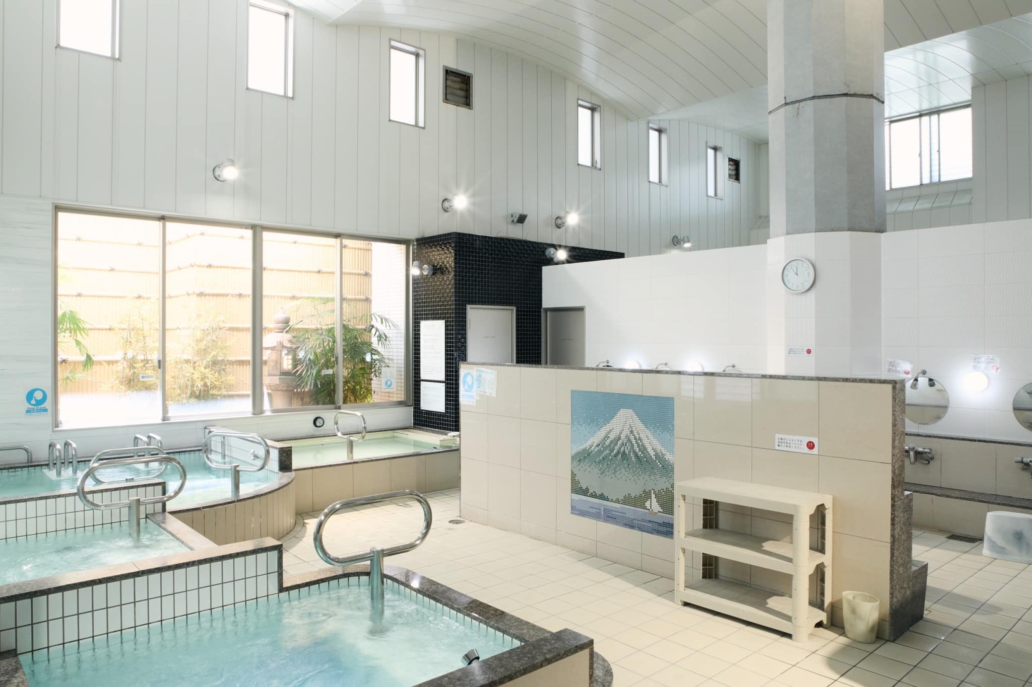 波打つような形状の高い天井が特徴的な、解放感あふれる浴場内。両方向に窓が設えられているので、双方から明るい陽の光が差し込みます。洗い場で控えめに存在感を放つのが、富士山のタイル絵。窓の外には竹塀や石灯籠が備わり、涼し気な印象を与えてくれています。